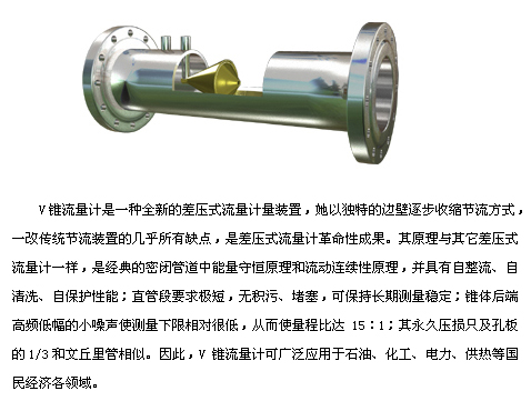 V錐流量計是一種全新的差壓式流量計量裝置,并以******的邊壁逐步收縮節(jié)流方式,一改傳統(tǒng)節(jié)流的幾乎所以缺點,是差壓式流量計革命性成果,因此V錐流量計可廣泛用于石油,化工,電力,熱供等國民經(jīng)濟(jì)各領(lǐng)域